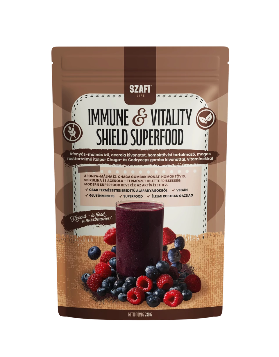 Áfonyás-málnás ízű, acerola kivonatot, homoktövist tartalmazó, magas rosttartalmú italpor Chaga- és Codryceps gomba kivonattal, vitaminokkal és édesítőszerrel